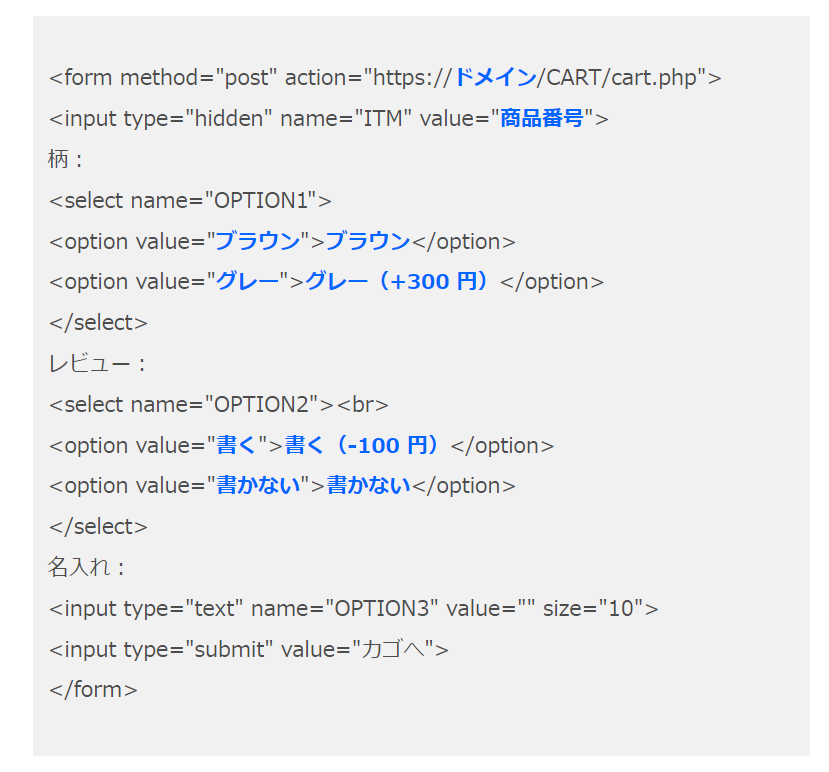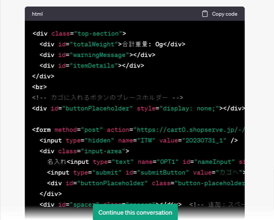 このソースを元に、作ってみたい複数商品をそれぞれ量り売りで買えるページの内容を書いたプロンプトをChatGPTに入力してみると、こんなソースが返ってきました。