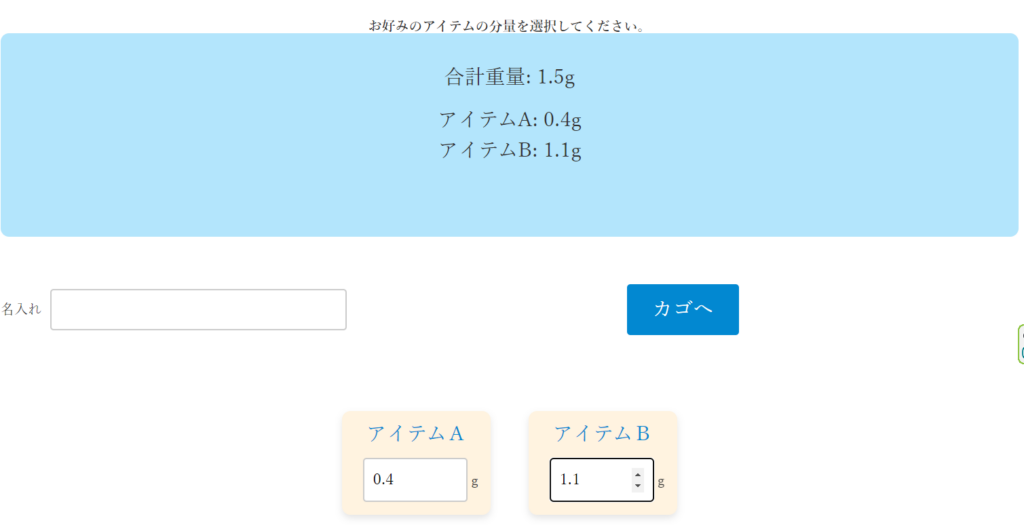 複数の商品についてそれぞれ重量を選んで注文するというのは、例えば、イチゴ味の飴を100グラム、レモン味の飴を50グラムと指定して買うことができるというようなことです。