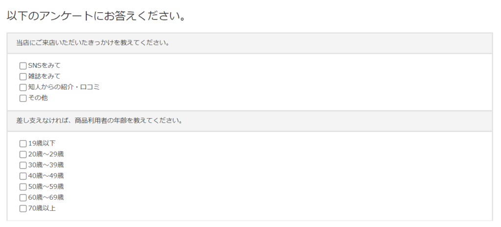 2つ目は「お届け先アンケート」です。会員・非会員の区別なく毎回の注文時に表示されるため、ギフト設定や商品の梱包、領収書の指定などを記入する場所として適しています。