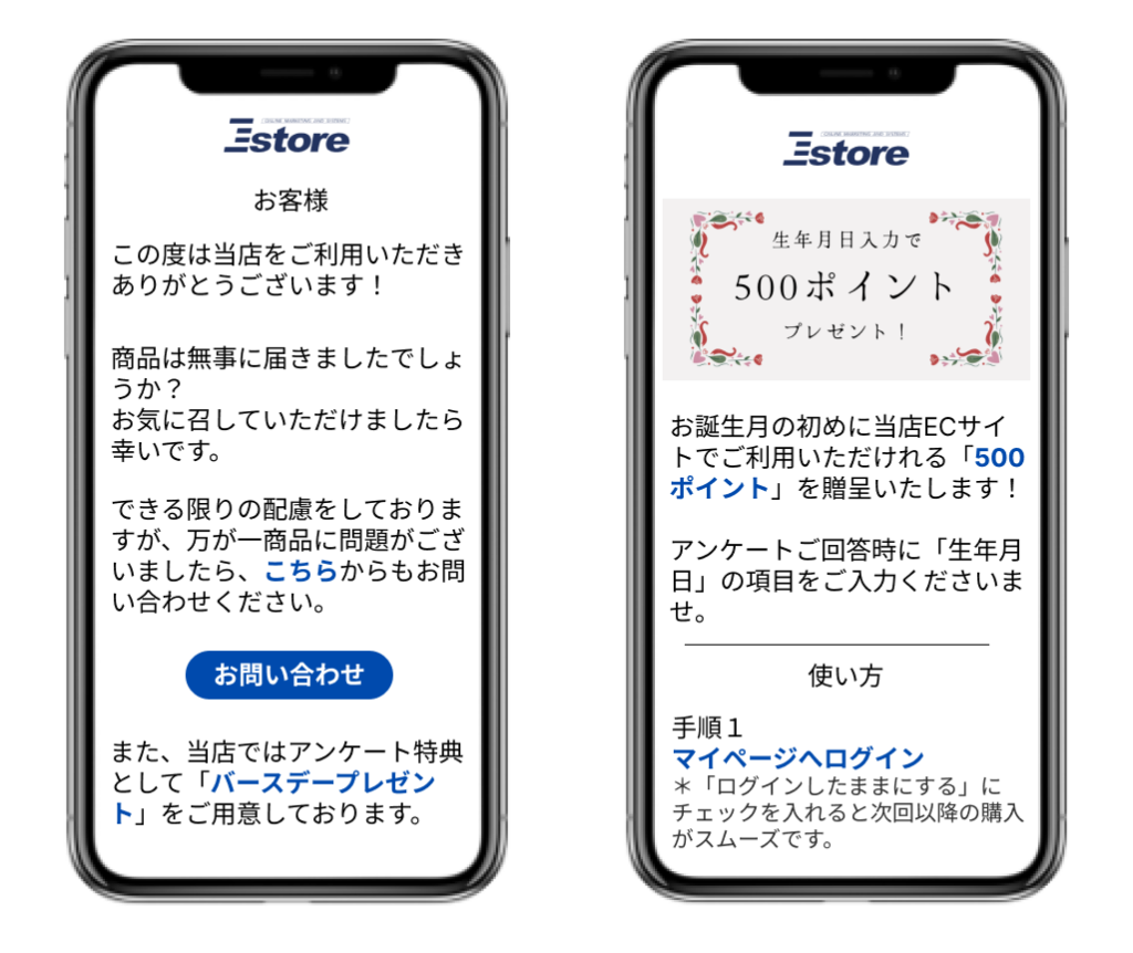 地方の特産品を販売している店舗さんでは、顧客にアンケートへのご協力依頼をする際に「バースデー施策」を組み込むことにしました。この施策では、メルマガのフォローメールを活用して顧客の声を自然に収集しつつ、リピーターを増やすという狙いがありました。フォローメールの内容では、商品の満足度や改善点を尋ねるほか、生年月日を入力する項目も追加し、回答してくれた方には「誕生日月に使える500ポイントをプレゼントする」と告知をしました。