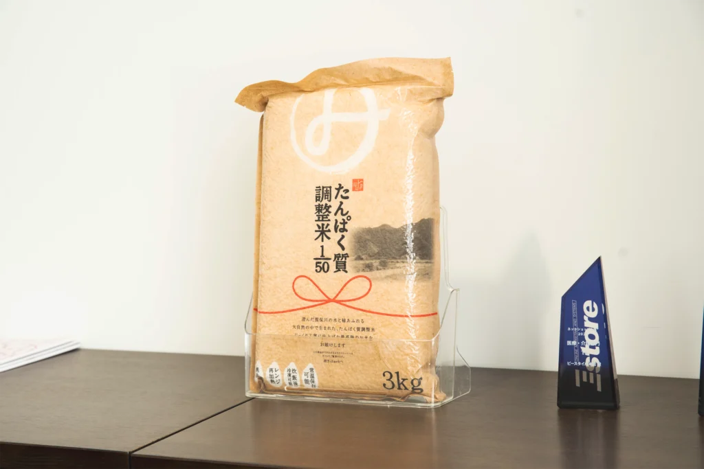 この課題を解決するため、自社商品の開発に着手し、栄養面の機能性を維持しつつ、見た目にもこだわっています。例えば米製品のパッケージに生産地の風景写真を使用したり、トレーに入っている商品を盛り付けた状態で撮影するなどの工夫をしたりしています。