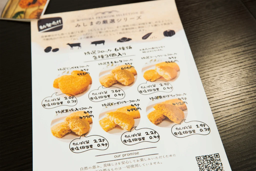 例えば、ある時広報の勉強で訪れた会社で、無添加コロッケを見つけたんです。これを見て「腎臓病の方にも楽しんでいただけるのでは」と思い、製造元の社長に相談しました。その結果、私たちと製造元の両方のブランド名で販売することになりました。このコロッケはタンパク質と塩分が少なく、添加物も不使用のため、安心して食べられます。販売後は「普通のコロッケが食べられる」と多くの患者さんに喜ばれています。